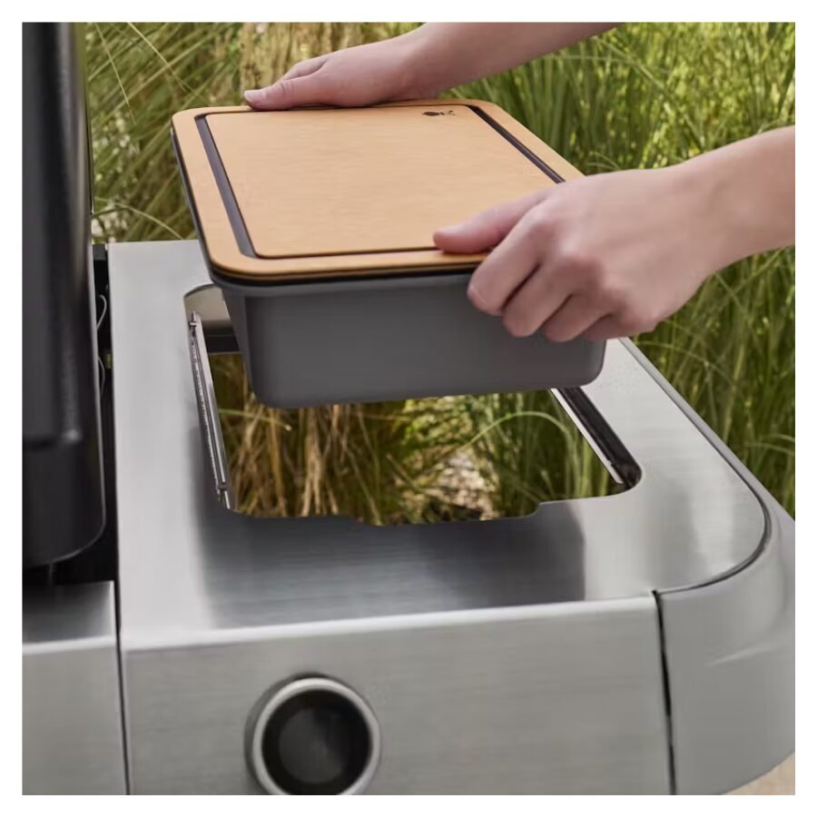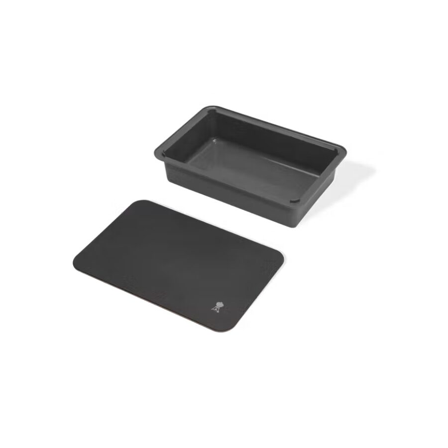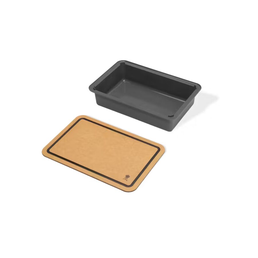 Prep, store, and carry food to the barbecue like a pro with the Weber Works Basin with Cutting Board Lid. This handy set includes a food-safe container with a lid that doubles as a two-sided cutting board. Marinate and store meats or prepped ingredients in the container, then transport them securely to the barbecue. Use one side of the cutting board for prep then flip it over for carving and serving. The basin and cutting board are designed for Weber Works compatible barbecues, griddles, smokers, stands, and tables.