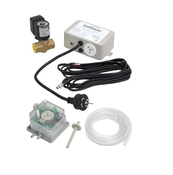 The Excelsior Interlock System comes complete with a 24V gas solenoid valve and air switch and allows the Excelsior Rangehood, or other approved rangehoods, to be powered via the interlock controller.