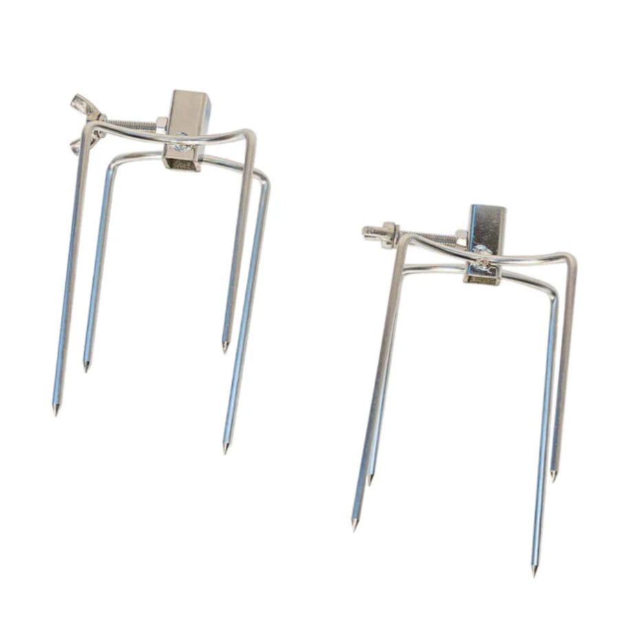 Small 4 Prong Rotisserie Forks for Chicken are suitable for affixing chickens, gyros, rolls of meat or pretty much any meat other than whole animals to a skewer. The long screw nut ensures you can fasten the prong tightly to the skewer to remove movement while cooking. Suitable for square spit roast skewers up to 10mm square in size. Will suit 6mm and 8mm square skewers also as the locking nut is long enough to penetrate through to the skewer