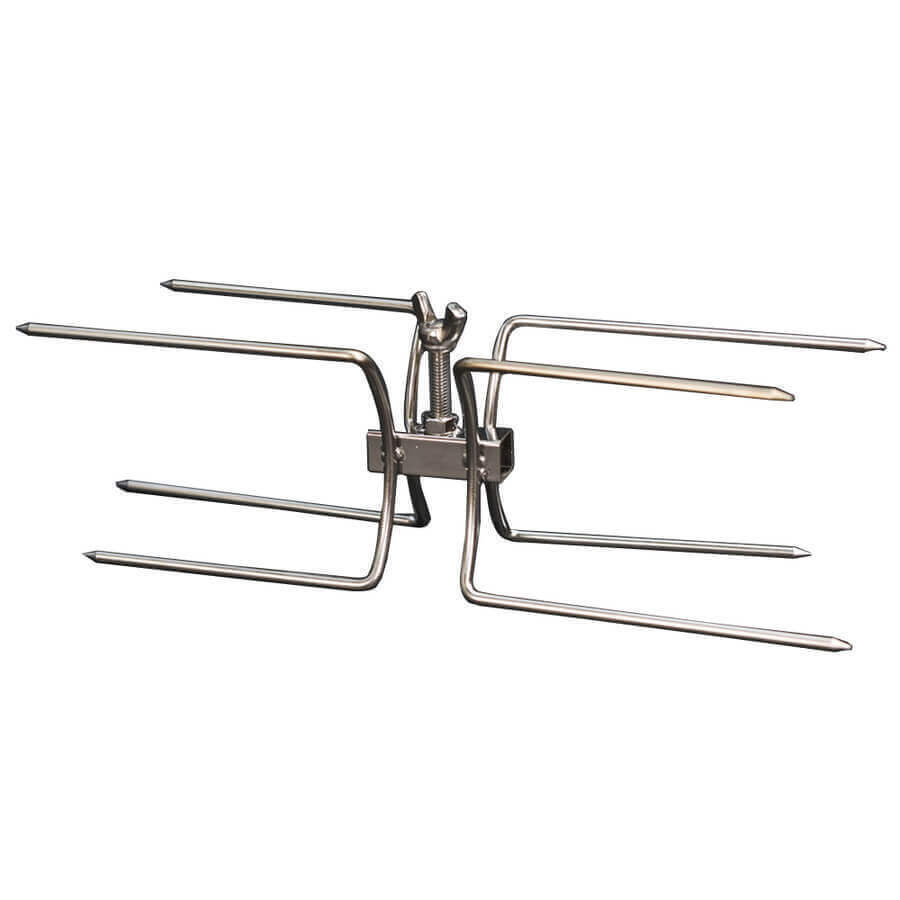 Double Ended Rotisserie Fork/Prong – 10mm are suitable for affixing chickens, gyros, rolls of meat or pretty much any meat other than whole animals to a skewer. It is designed to be used in between 2 other pronges. The long screw nut ensures you can fasten the prong tightly to the skewer to remove movement while cooking. Suitable for square spit roast skewers up to 10mm square in size. Will suit 6mm and 8mm square skewers also as the locking nut is long enough to penetrate through to the skewer