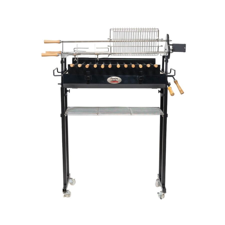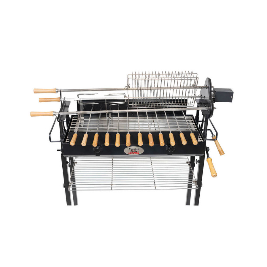 This Deluxe Foukou Cyprus Grill Spit – 3mm thick is the best quality Cyprus Grill Spit around with extra features such as an additional stainless steel charcoal pan, a warming rack, simple height adjustment, 10mm diameter‚ long skewers, 5mm diameter kebab skewers, basket, 2 gyros disks‚ and 2 chicken prongs.