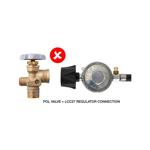 The new Gasmate Safe Lok® LCC27 cylinder connection has a larger and easy to use right threaded handwheel, making it more intuitive to connect and easier to tighten. The pressure regulator has thermal cut-off which will stop the gas flow in case of fire. Can only be used with gas cylinders with new LCC27 valve.