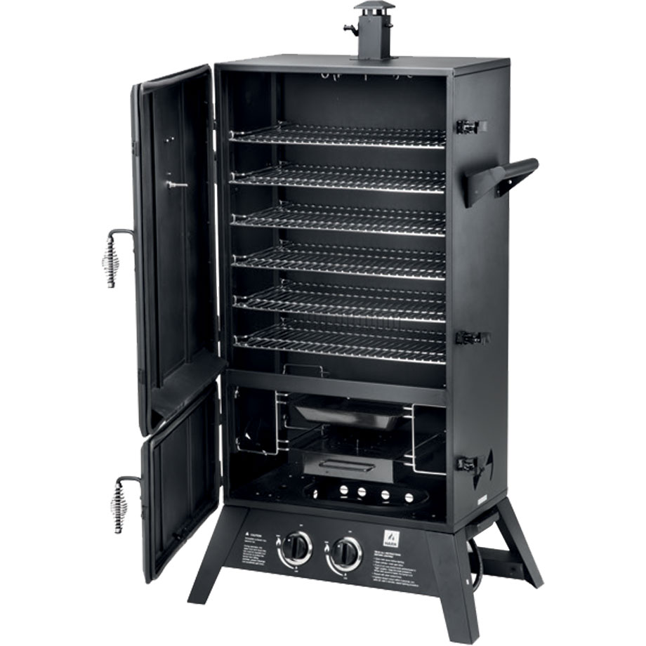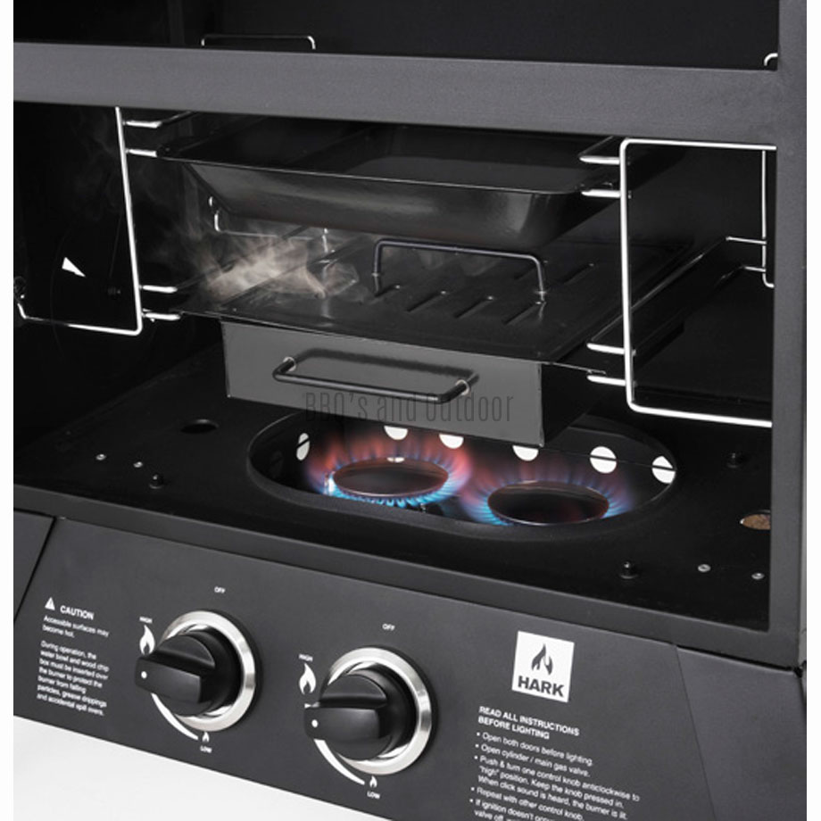 The Hark Big Boss Gas Smoker is a commercial grade vertical smoker, powered by a standard gas bottle. The largest gas smoker in the Hark range, the Big Boss has two powerful burners, two doors, two dampers and six shelves.