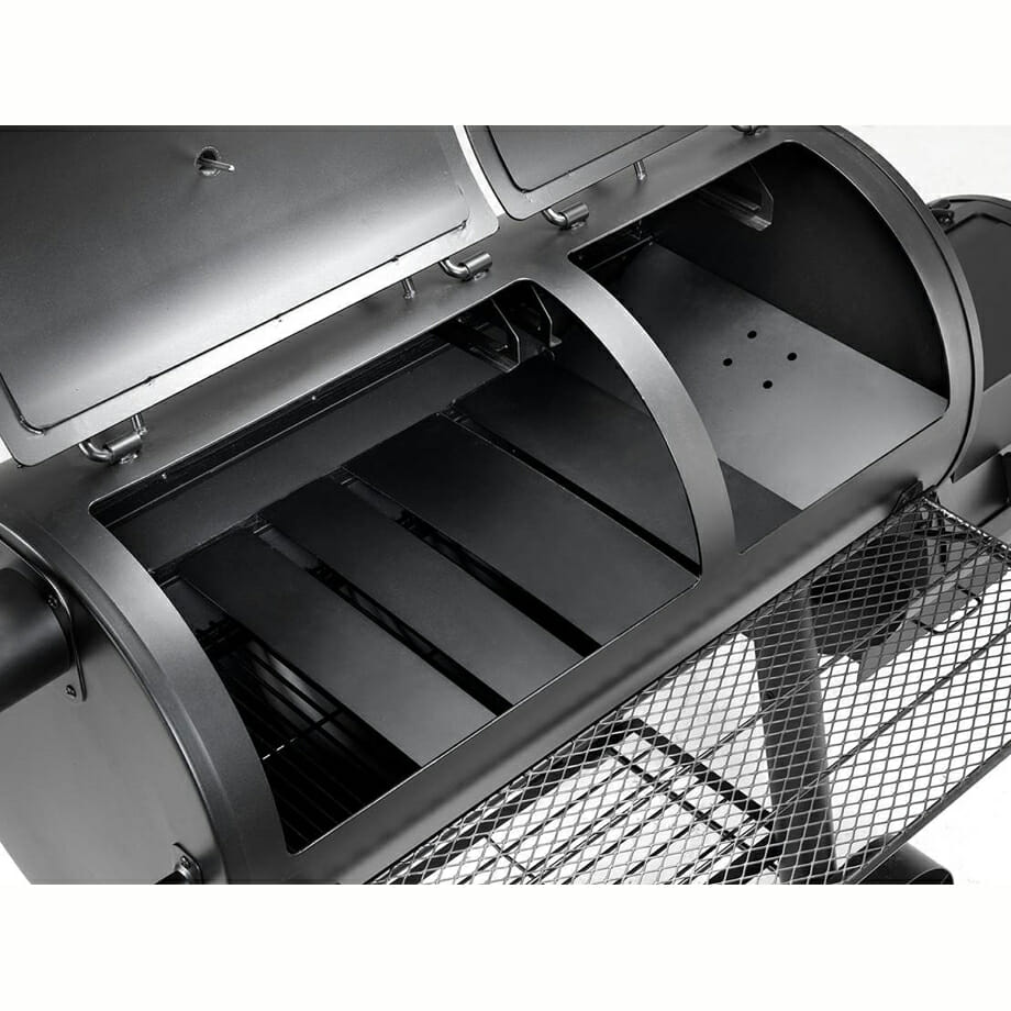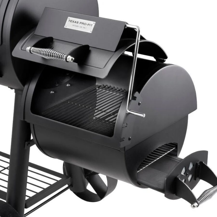 The Texas Pro-Pit has two doors for ease of access, large cooking grids and warming shelves, adjustable baffles, damper, and firebox lid, large heavy-duty tube legs, and a handy wood storage shelf.