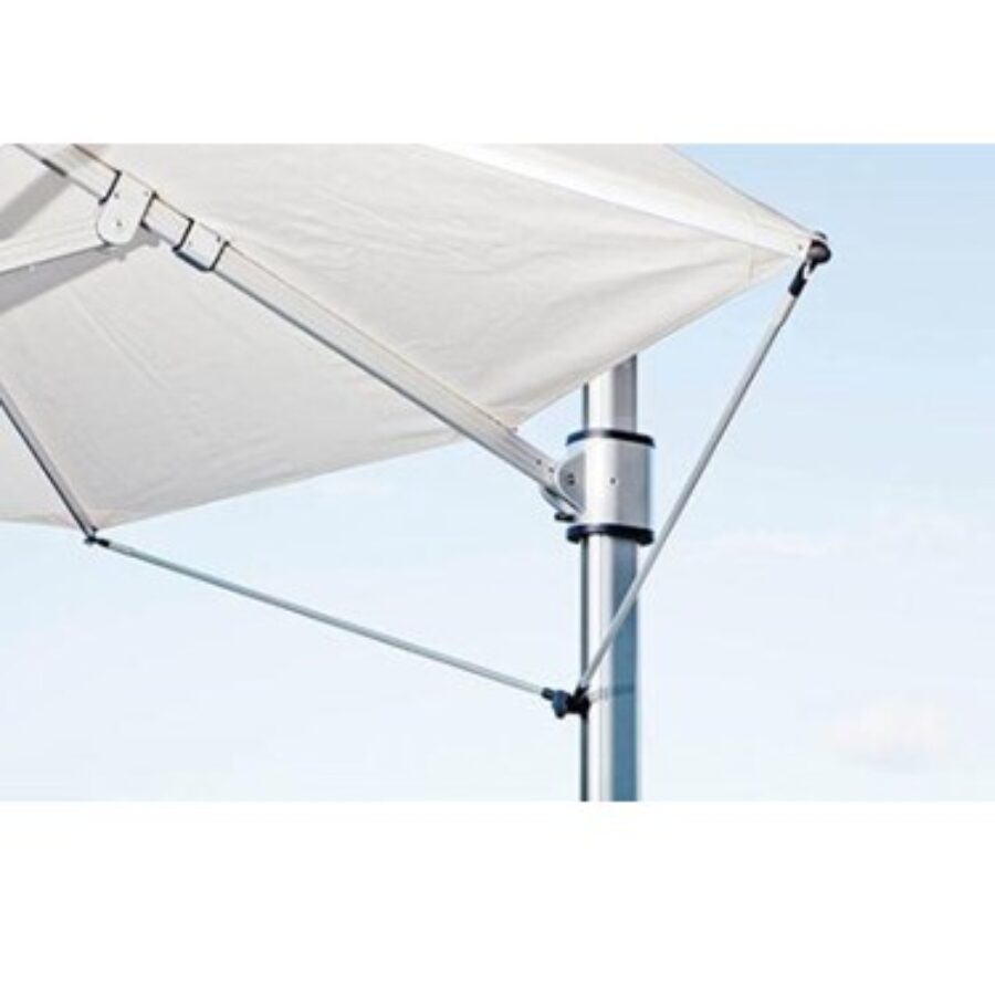 The Aurora cantilever umbrella has a uniquely designed fixed arm stabiliser bars. These stabiliser arms will greatly increase the umbrellas stability on windy days. The stabiliser bars screws into a mounting block already installed in the groove of the umbrella mast. Each stabiliser arm then attaches to the end of the umbrella arms to the left and right. The stabiliser bars are designed for an environment where the umbrella needs to be up for longer periods of time and windy conditions.