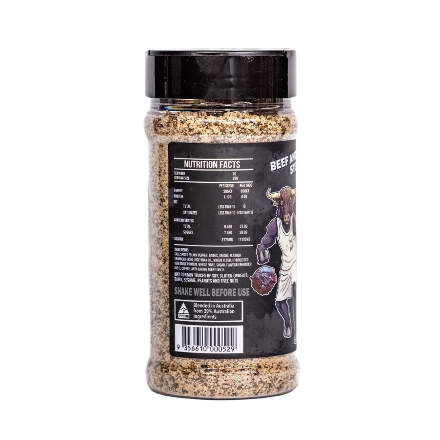 Ingredients: Salt, Spices (black pepper, garlic, onion) Flavour Enhancer 635, Rice Bran Oil, Wheat Flour, Hydrolyzed Vegetable Protein, Wheat Fibre, Sugar, Flavour Enhancer 621, Coffee, Anti Caking Agent 551