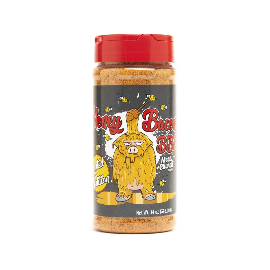 With Honey Hog rub as the base and with added bacon, Honey Bacon BBQ Rub may be Meat Church’s best tasting rub straight out of the bottle. It also comes with more of their signature unique and funny BBQ art on the front of the bottle. Get this limited edition fast, because when it’s gone, it’s gone!
