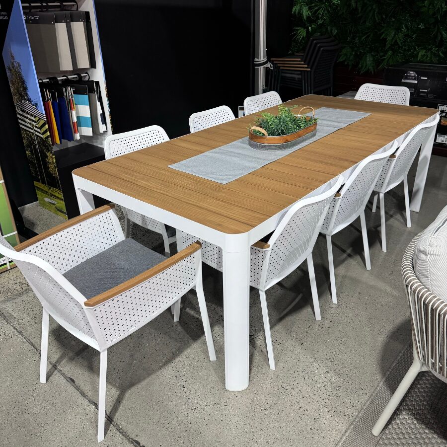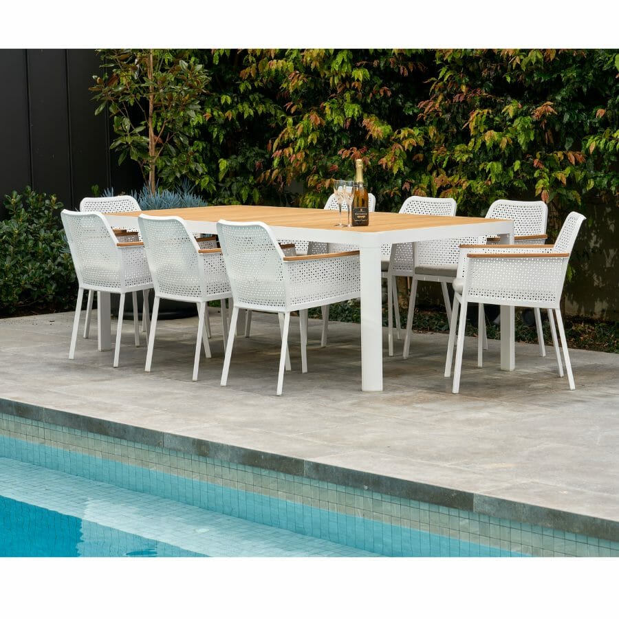 Featuring a white aluminium frame with a teak insert table top, be the chat of the neighbourhood with this stunning table. Add your 8 Apex Chairs in White to finish off the look.