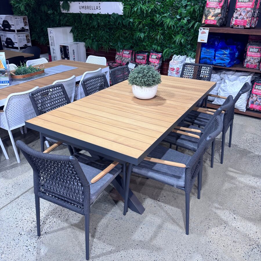 Paired with the sleek Austin aluminum chairs featuring elegant teak armrests, this ensemble is more than just functional—it’s a statement piece. The combination of durable materials and refined design ensures comfort and style, making it the centerpiece of your outdoor space.