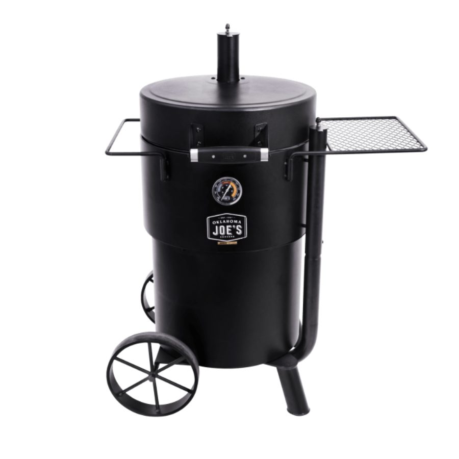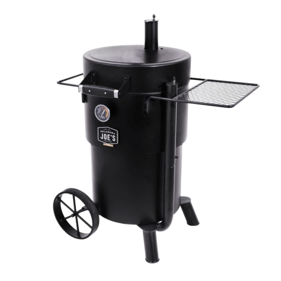 The Oklahoma Joes Bronco Drum Smoker has a unique airflow control system and sealed lid that deliver precise control over smoke and heat. Its movable grate and additional meat hangers let you customise your setup your way, while the oversized charcoal basket holds enough fuel for all-day smoke therapy.