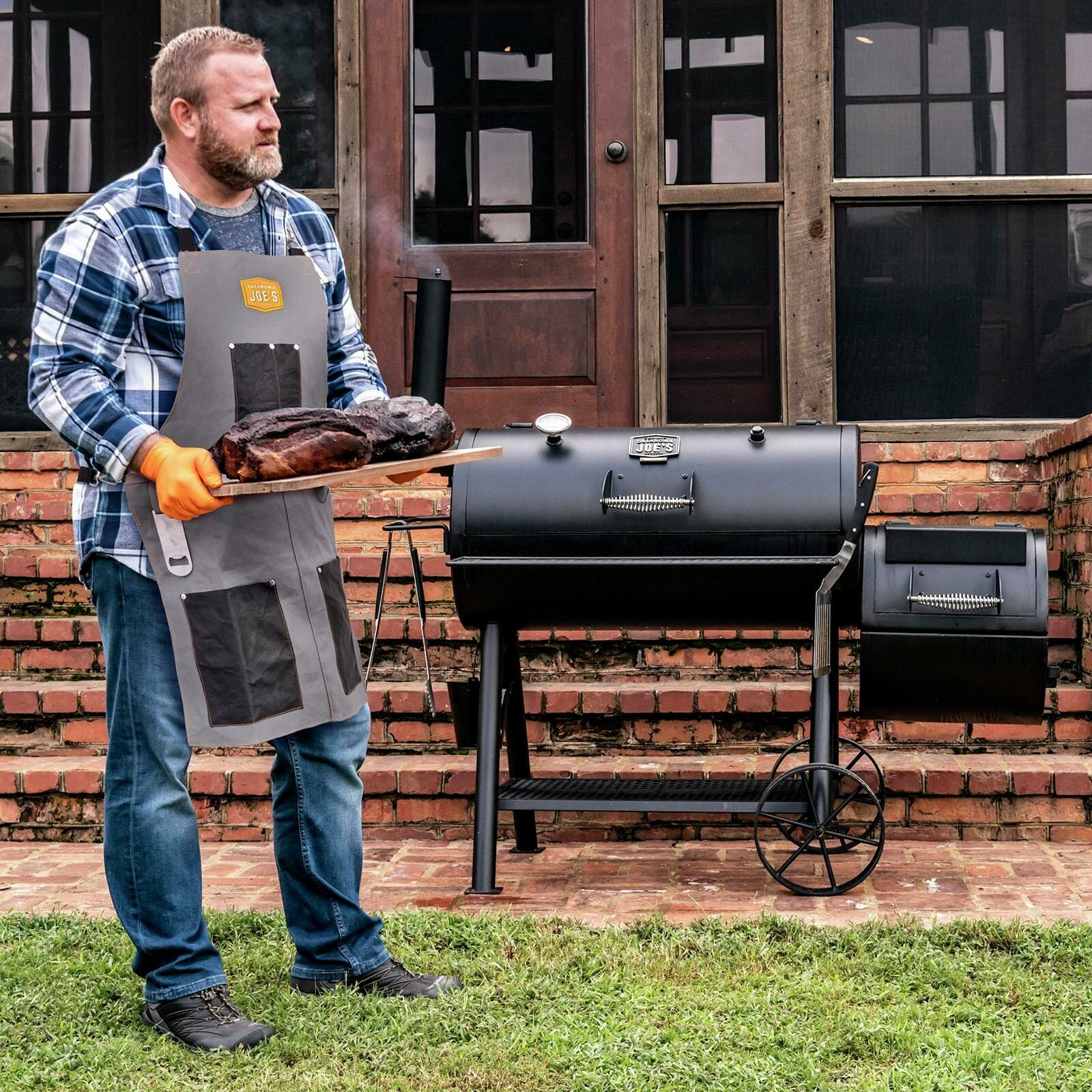 The Oklahoma Joe’s® Smoking Apron delivers the protection you need without weighing you down. Made of lightweight canvas and leather, this apron offers functionality and comfort without sacrificing style or quality. The Smoking Apron is specially designed to hold everything you need, and nothing you don’t.