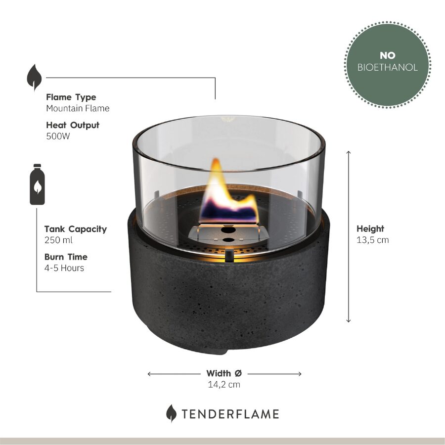 The Tenderflame Café 14 only burns on Tenderfuel, a safer alternative to traditional bioethanol. This innovative fuel in combination with the stainless steel wick, guarantees a clean burning experience, free from smoke, odour, and soot, ensuring your comfort and peace of mind. For those who value both elegance and safety, The Tenderflame Café 14 in lava porcelain is the perfect addition to enrich any indoor setting with warmth and style.