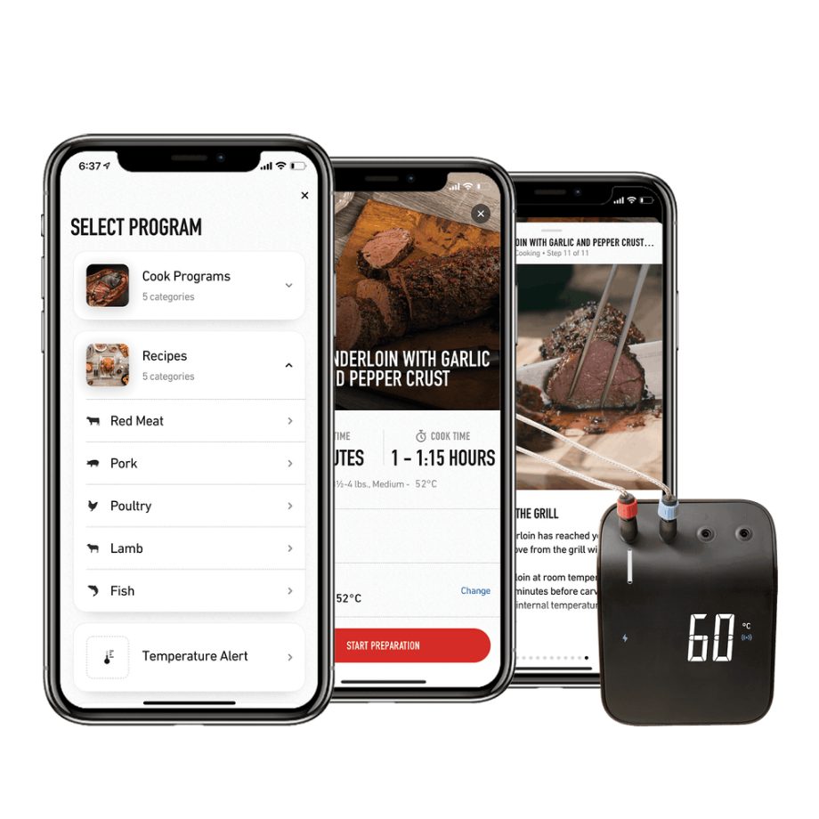 • Select doneness (medium-rare steak) and receive alerts when ready