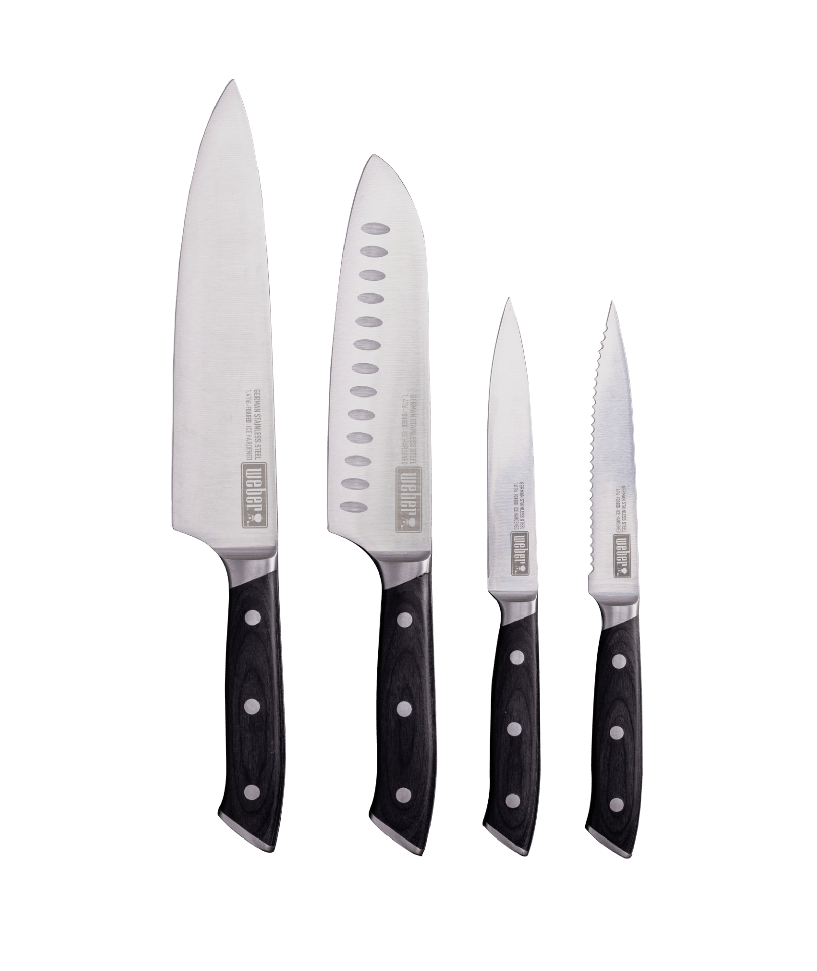 Containing all four of the Weber everyday knifes; the 20cm (8″) Chef Knife, 18cm (7″) Santoku, 15cm (6″) Utility, and 15cm (6″) Serrated Utility.