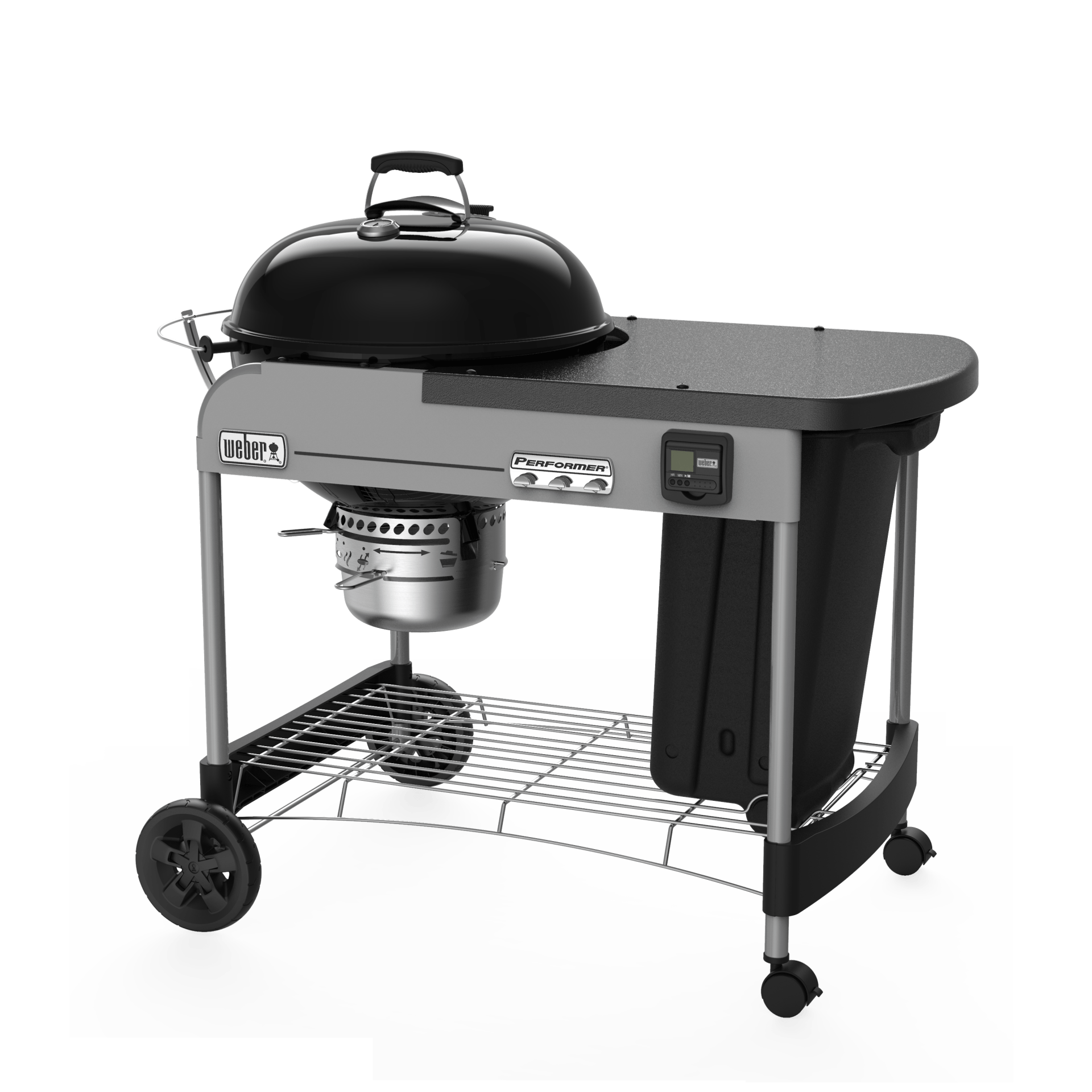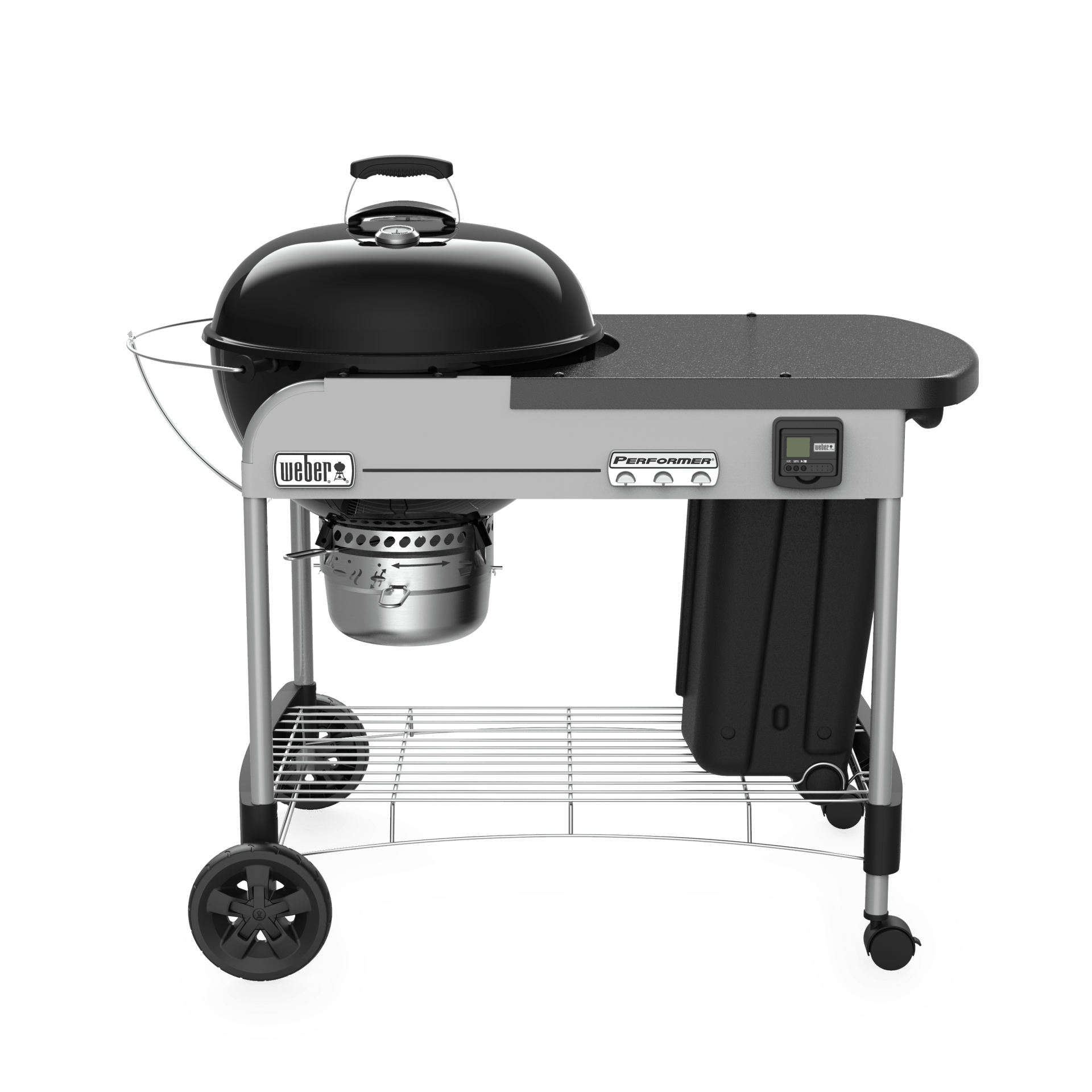 The ultimate kettle is the Weber Performer Premium. The convenient work surface is made of heat resistant Steel Work Table and underneath is a pull out storage bin for items such as smoking woods and drip trays.