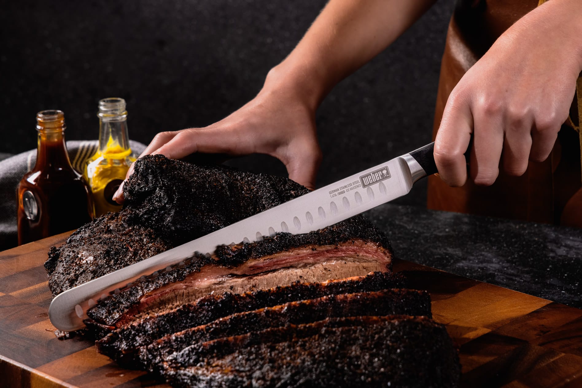 The hollow-edge design on this slicing knife runs the full length of the blade, reducing friction and delivering a smooth, easy and comfortable slicing experience. The razor-sharp cutting edge makes short work of the largest brisket, through to a thinly sliced segment of sashimi.