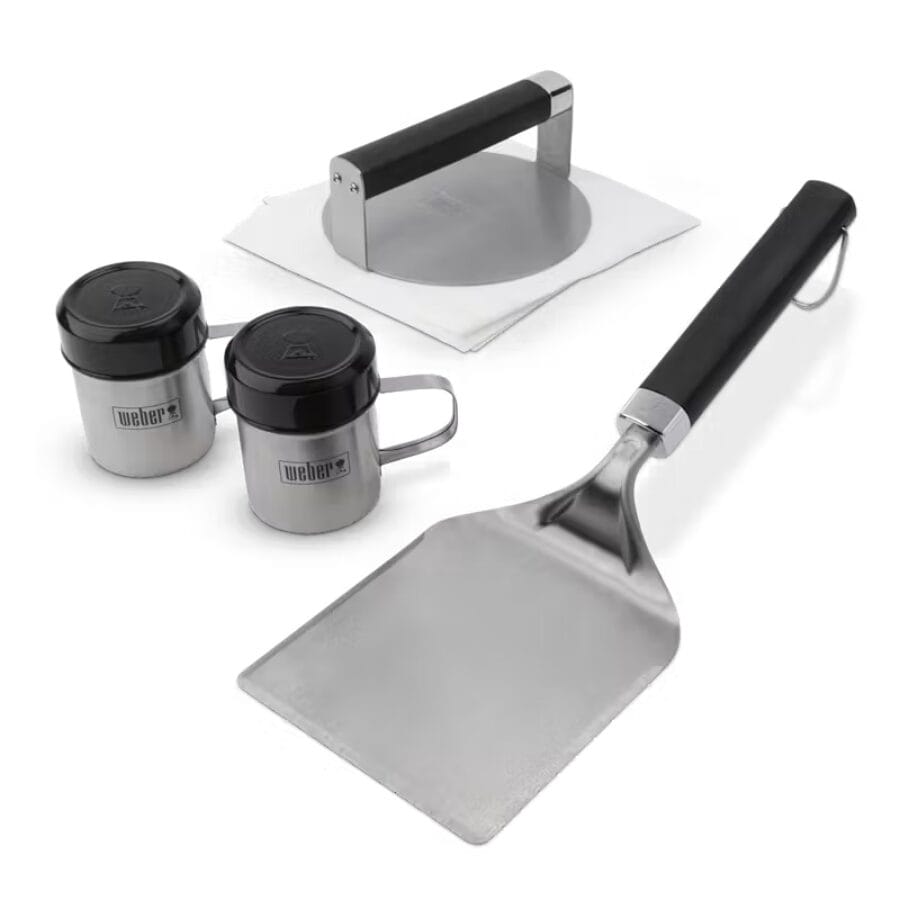 • Includes: Smashed Burger Press, patty paper, wide spatula, and two seasoning shakers
