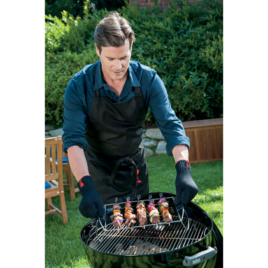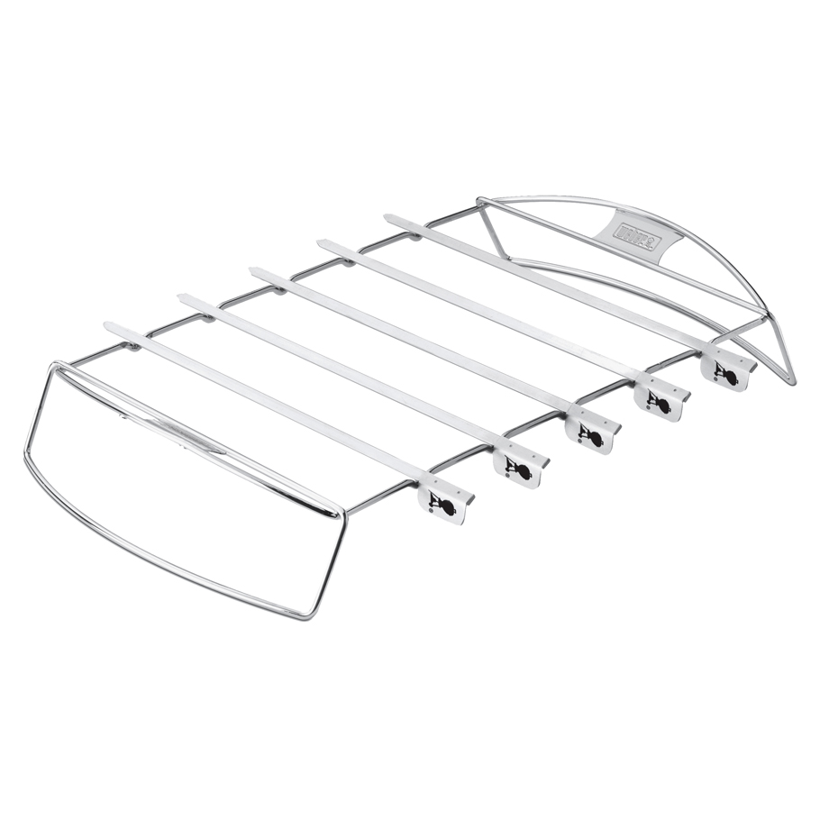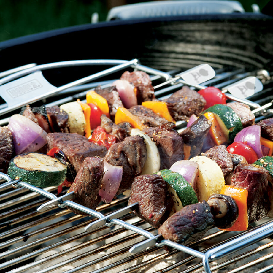 Product Description: The Weber Kabob Set features flat rather than round skewers. These skewers are designed to hold food in place when the skewer is turned. The unique design allows you to turn the skewers easily while in the stainless steel rack. Perfect for satays and kabobs