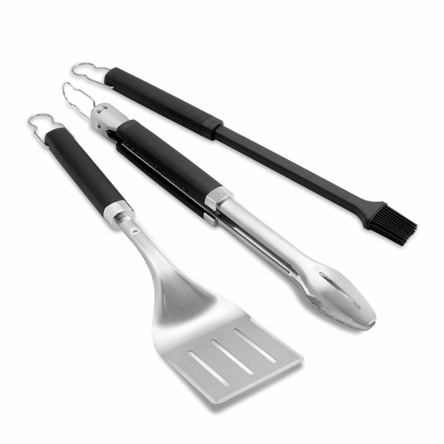 The Precision Barbecue Tongs, Spatula and Basting Brush Set is designed for performance. Both Tongs and Spatula feature a durable stainless-steel construction and soft-touch handle for comfort and control. The hands-free locking tongs are designed with a flat front edge that provides a secure grip as you lift and turn fragile foods. The basting brush has easy to clean silicone bristles. The spatula features a 3-sided bevelled edge to easily slide under foods. These tools are dishwasher-safe for easy cleaning.
